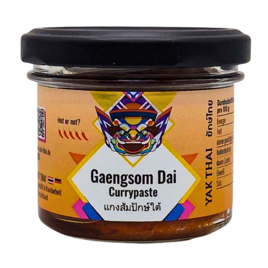 - „Gaengsom Dai“ ist eine scharfe, säuerliche Currypaste aus dem Süden (Dai) Thailands, die traditionell für suppenartige Currys mit Fisch oder Meeresfrüchten verwendet wird. Anders als cremige Kokos-Currys basiert dieses Gericht auf einer klaren Brühe, die durch die Paste eine kräftige, zitronige und feurige Note erhält.