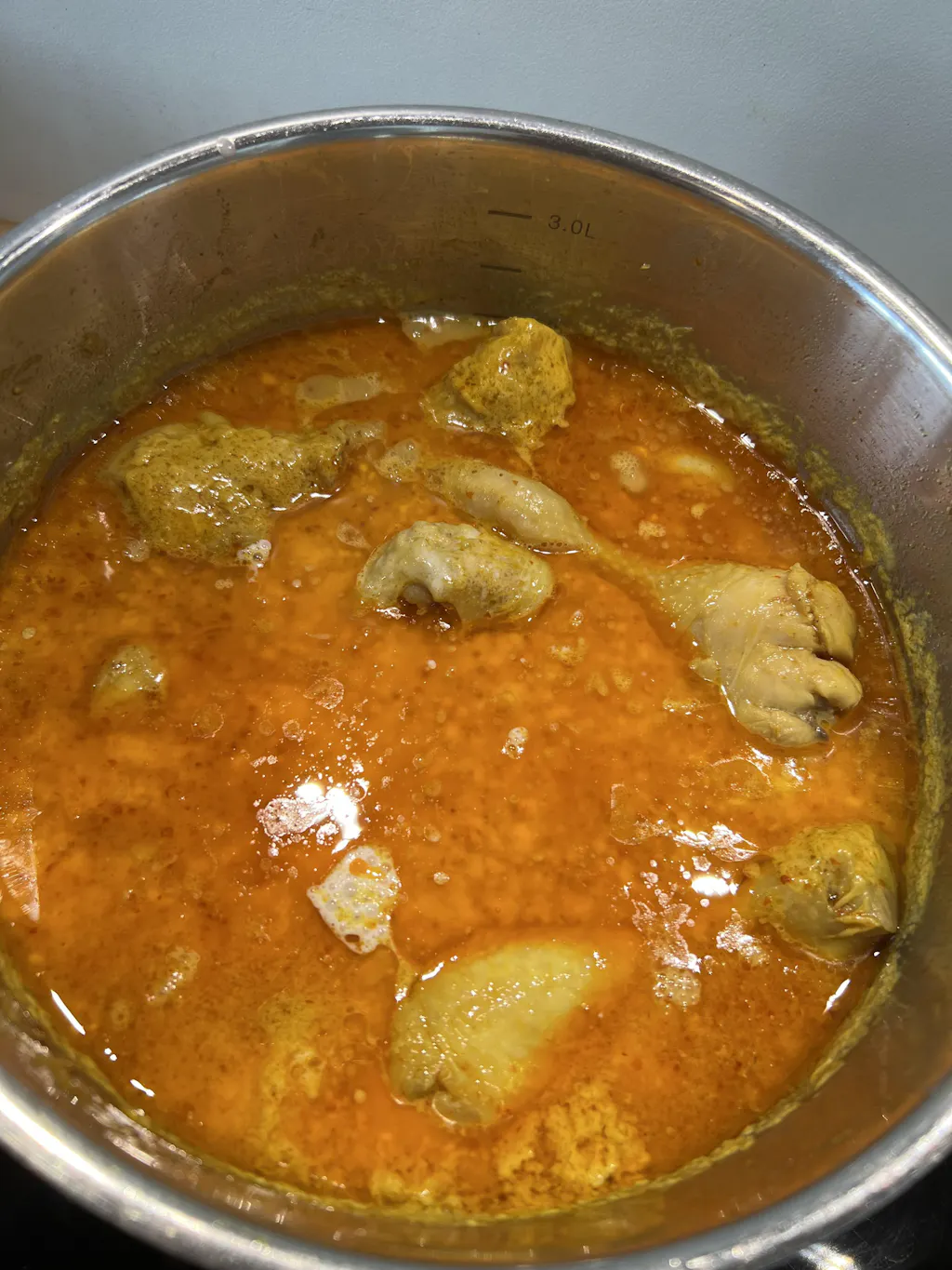 Gaeng Phed Gai Man Farang ist ein cremiges thailändisches rotes Curry, bei dem Hähnchenfleisch und Kartoffeln in einer kokosmilchbasierten Soße gekocht werden.
