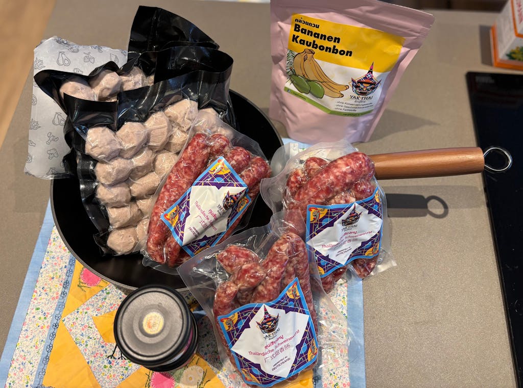Our sausages are prepared according to an original Thai recipe. Due to the spices, the taste differs considerably from German sausages in some places.